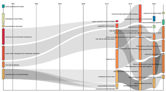 Also, a Sankey diagram was constructed to represent the evolution and connection of the different topics related to polyelectrolytes over a time scale in an efficient manner. The diagram showed interrelated keywords through the flows of gray color [29], with the combinations of keywords “full cells & catalysts” and “nanostructures & nanotechnology” being prominent during the period of 1990–2010 (See Figure 5). These combinations converged into various combinations such as “full cells & solid electrolytes”, “solid electrolytes & ionic conductivity”, “solid electrolytes & solid-state batteries”, and “lithium compounds & solid-state batteries”, and “multilayers & cell culture”, “cytology & cell culture”, “tissue engineering & bone”, and “targeted drug delivery & controlled drug delivery” during the periods 2010–2015, 2015–2020, and 2020–2022, respectively. Hence, it can be inferred from the temporal flows that polyelectrolytes have been highly relevant in the generation of energy devices, tissue engineering, and the design of systems for targeted drug delivery, owing to their unique physical properties such as adjustable surface charge, the absence of glass transitions, insolubility in common organic solvents, stable structures, and high surface hydrophilicity, making them ideal candidates for the development of proton exchange membranes in fuel cells [30]. Additionally, polyelectrolytes meet the profile requirements of biocompatible polymer systems and can be adapted as carriers and components for active substances [1]. It is noteworthy that the divergence and convergence of streams, as well as the transformations of keywords, showed the dynamic evolution of the polyelectrolyte research field over time.
