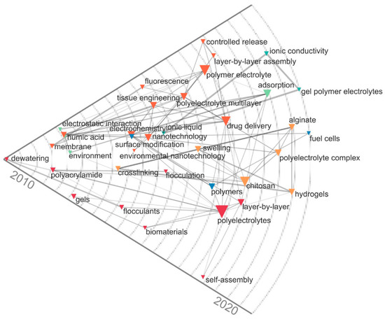 Additionally, the historical map was developed in the period 2010–2020 and showed the relationships between the most important keywords according to the co-occurrence measures of the scientific publications on polyelectrolytes, (See Figure 6). This analysis complemented the flows observed in the Sankey diagram, highlighting developments in tissue engineering, fuel cells, wastewater treatment (flocculation systems), and drug delivery in the last decade. Additionally, a trend towards the use of gel polymer electrolytes in fuel cell production was observed, as this type of material can be used as liquid solutions providing electrochemical properties, solid hosts ensuring mechanical strength, and added fillers enhancing ionic conductivity [31]. In general, the bibliometric analysis was important to establish the current trends on polyelectrolytes and the dynamics of scientific research from the linkage of the specialized literature. Also, the analysis makes a significant contribution to the study of technological advances in polyelectrolytes and provides some representative suggestions to researchers working on the subject.