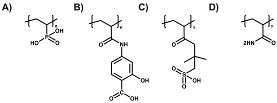 (A) Poly (vinylphosponic acid), (B) Poly(N-methacryloyl-4-aminosalicylic acid), (C) Poly(2-acrylamido-2-methyl-1-propanesulfonic acid), and (D) Poly(acrylamide).