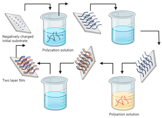 Schematic of the substrate adsorption and double layer film formation in polycation and polyanion solution [151].