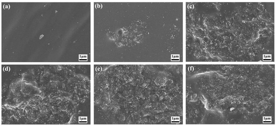 Figure 1. SEM images of the MWCNTs/NR composites with different MWCNT loadings: (a) 0 phr, which is the control group; (b) 1 phr; (c) 2 phr; (d) 3 phr; (e) 4 phr; and (f) 5 phr.