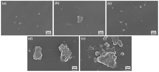 Figure 2. SEM images of the MoSi2/NR composites: (a) 1 phr of MoSi2; (b) 2 phr of MoSi2; (c) 3 phr of MoSi2; (d) 4 phr of MoSi2; and (e) 5 phr of MoSi2.