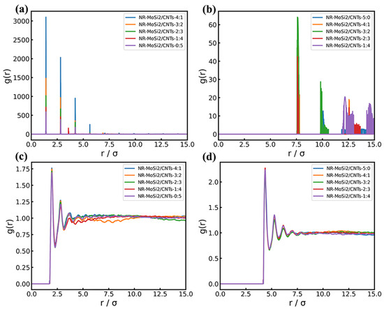 Figure 4. Radial distribution function (RDF) of MoSi2/MWCNTs/NR systems between (a) MWCNT beads and MWCNT beads; (b) MoSi2 beads and MoSi2 beads; (c) MWCNT beads and NR beads; and (d) MoSi2 beads and NR beads.