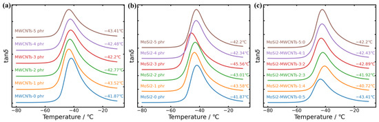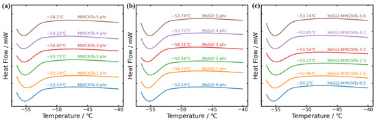 Figure 5a illustrates the variation in Tg for the MWCNTs/NR system. Upon the addition of 2 to 3 phr of MWCNTs, a slight increase in Tg can be observed, relative to the Tg, which MWCNTs added up to 1 phr. However, the overall trend revealed a gradual decrease in Tg (from −53.53 °C to −54.2 °C) as the filler concentration increased. This phenomenon may be attributed to the hollow structure of MWCNTs, which provides additional free volume, enhancing the molecular chain mobility. Figure 5b depicts the Tg variation for the MoSi2/NR system. With increasing filler content, Tg underwent a slight decline, followed by an increasing trend, suggesting that a limited quantity of filler particles enhanced the chain segment mobility at low temperatures. In addition, as shown in Figure 5c, the incorporation of MoSi2 dominated the increasing trend of Tg in MoSi2/MWCNTs/NR systems. Hence, excessive MoSi2 content is adverse to keeping a low Tg in composites.