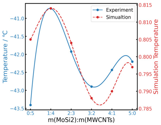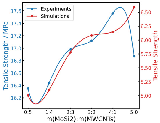 The results of MD simulations further support the findings depicted in Figure 8. As shown in Figure 9, the mechanical properties of the MoSi2/MWCNTs/NR system obtained using MD simulations are presented with those of mechanical testing. The tensile strength increased with increasing MoSi2 filler quantities across the first five mass ratios (the m(MoSi2): m(MWCNTs) ratio equal to 0:5, 1:4, 2:3, 3:2, 4:1), yielding the best mechanical property when the ratio of the two reached 4:1. However, the tensile strength of the composite containing MoSi2/MWCNTs resulting from MD simulation was much higher than that measured by experimental tensile testing when the mass ratio of MoSi2/MWCNTs was 5:0. This can be explained by the fact that MD simulations are always performed in a small scale of time and space; in order to obtain simulation results in a limited computational time, the tensile simulation will be performed at a very high tensile rate. Compared with the experimental tensile rate, it may extend the increasing trend of the tensile strength in the MD simulation result. Furthermore, the simulation models of composites will have a more ideal structure than experimental composites. Thus, the tensile strength of the simulation was still increasing when the mass ratio of MoSi2/MWCNTs was 5:0.