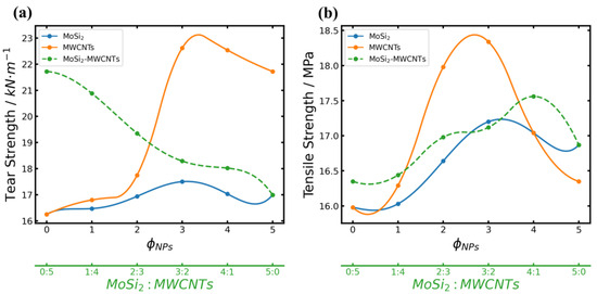 Figure 8. Mechanical properties of the inorganic fillers/NR composites: (a) tear strength and (b) tensile strength of MoSi2/NR (blue solid line), MWCNTs/NR (orange solid line), and MoSi2/MWCNTs/NR (green dashed line).