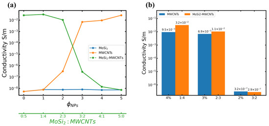 Figure 10. (a) Conductivities of NR–MoSi2 (blue solid line), MWCNTs/NR (orange solid line), and MoSi2/MWCNTs/NR (green dashed line); (b) conductivity bar plots ofMWCNTs/NR (blue) and MoSi2/MWCNTs/NR (orange).