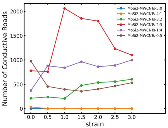 According to the trajectory data derived during the stretching simulations, the number of conductive pathways along the stretching direction was calculated. The information of conductive pathways across different composite systems during stretching along the z-axis is shown in Figure 11. At zero strain, the conductive pathways of the MoSi2/MWCNTs/NR-5:0 and MoSi2/MWCNTs/NR-4:1 systems were insignificant (always 0). Upon reaching a CNT content of 2 phr, a substantial change in the number of conductive pathways was observed from approximately 0 to about 250. When the mass fraction of MWCNTs ranged from 2 phr to 3 phr, there was a significant increase in the conductive pathways number, implying that the percolation threshold of the MoSi2/MWCNTs/NR system under non-tensile conditions lies between 2 and 3 phr. Under tensile strain ranging from 0 to 300% along the z-axis, both the MoSi2/MWCNTs/NR-3:2 and MoSi2/MWCNTs/NR-1:4 systems exhibited an augmentation in the number of conductive pathways after stretching, followed by a plateau, indicative of the stretching-induced formation of conductive pathways within the system. At a strain of 50–100%, an obvious increase in the number of conductive pathways was observed in the MoSi2/MWCNTs/NR-2:3 system, followed by a subsequent decline in proximity to the number observed in the MoSi2/MWCNTs/NR-1:4 system.