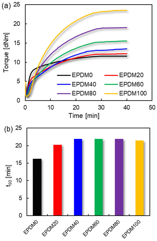 The combination of more than two different rubbers is frequently used which can improve the deficiencies of existing rubber performance [19,20,21,22,23]. The vulcanization characteristics of EPDM/CIIR blends are shown in Figure 1.