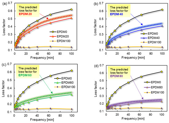 The measured and predicted tanδ of rubber blends. (a): The predicted loss factor for EPDM 20, (b): The predicted loss factor for EPDM 40, (c): The predicted loss factor for EPDM 60, (d): The predicted loss factor for EPDM 80.