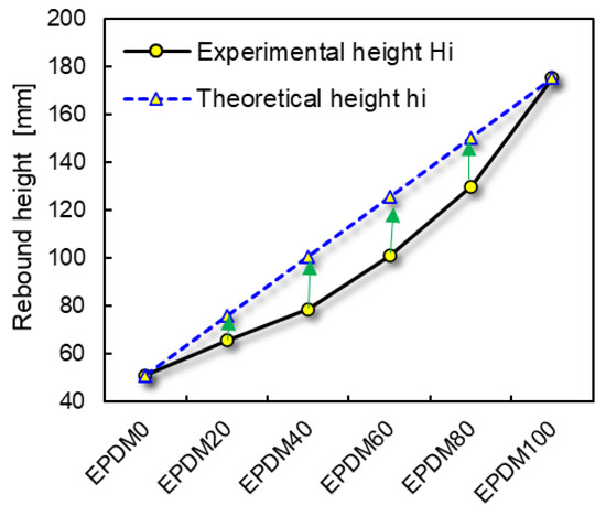 Figure 6 shows the difference of the theoretical and measured rebound heights (hi − Hi) firstly increases and then decreases with the increase in EPDM content in the raw rubber system. In other words, the larger the difference between the two rubber ratios, the lower the error of the Equation (18).