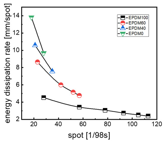 The changes in the EDR with time for the rubber balls based on different rubber blends are described in Figure 8. By longitudinally comparing the EDR values of each sample with time we can find that both the EDR of the rubber ball and the time interval between each two data points decrease gradually. It can be concluded that the damping capacity decreases with the decrease in external excitation of the rubber ball when it falls within 300 mm, and the time interval between two adjacent rubber balls reaching the highest point becomes smaller due to the gradual decrease in the rebound height during the bouncing process. It also indicates, as shown in Figure 8, that the EDR value is the highest for the pure CIIR and lowest for the pure EPDM, showing a decreasing trend with the increase in EPDM content in the rubber blends.