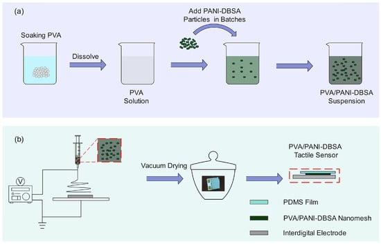 To reduce the influence of humidity and temperature on the diameter and morphology of fibers, the electrospinning process was carried out at a constant temperature and humidity laboratory at 25 °C and 45%RH. The sensor preparation process is shown in Figure 1b: 1 mL of the suspension prepared in the preceding step was moved into a plastic syringe, and the electrospinning process took place for 10 in a confined environment. The parameters of the process were set as follows: voltage: 14 kV, tip-to-collector distance: 7.5 cm, solution flow rate: 0.15 mL/h, and inside diameter of the needle: 0.6 mm. The nanofibers were collected on top of the interdigitated electrodes placed on the ground collector and by vacuum drying 12 h prior to use. Then, a polydimethylsiloxane (PDMS) film was placed on the PVA/PANI-DBSA nanomesh to provide encapsulation for PVA/PANI-DBSA tactile sensor.