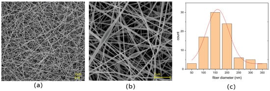 SEM images of PVA/PANI-DBSA nanofibers at different magnifications: (a) 2000× and (b) 8000×. (c) The nanofibers’ diameter distribution analyzed according to (a).