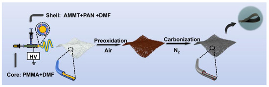 Polyacrylonitrile (PAN, Mw = 150,000) and polymethylmethacrylate (PMMA, Mw = 35,000) were purchased from Shanghai Macklin Biochemical Co., Ltd., Shanghai, China. Ammonium molybdate tetrahydrate (AMMT) and N, N-dimethylformamide (DMF) were supplied by Sinopharm Chemical Reagent Co., Ltd., Shanghai, China.