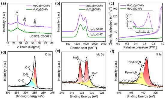 (a) XRD patterns of the MoO2@HCNFs and MoO2@CNFs; (b) Raman spectra of the MoO2@HCNFs and MoO2@CNFs; (c) nitrogen adsorption−desorption isotherm curves of the MoO2@HCNFs and MoO2@CNFs (inserted: pore size distribution curves); high−resolution XPS spectra of the MoO2@HCNFs: (d) C 1s, (e) Mo 3d, and (f) N 1s.