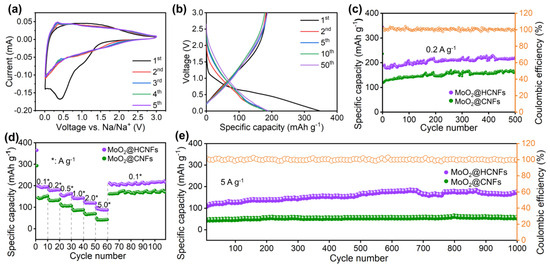 (a) CV curves of the MoO2@HCNF electrode at the scan rate of 0.2 mV s−1 for SIBs; (b) galvanostatic charge/discharge curves of the MoO2@HCNFs at 0.2 A g−1 for SIBs; (c) cycle performance, (d) rate performance, and (e) long cycle performance of the MoO2@HCNFs and MoO2@CNFs for SIBs.