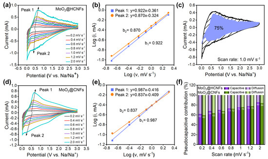 (a) CV curves of the MoO2@HCNFs at different scan rates; (b) corresponding log(i) versus log(ν) linear relationships at peaks; (c) pseudocapacitive contribution of the MoO2@HCNFs at scan rates of 1.0 mV s−1; (d) CV curves of MoO2@CNFs at different scan rates; (e) corresponding log(i) versus log(ν) linear relationships at peaks; (f) pseudocapacitive contribution of the MoO2@HCNFs and MoO2@CNFs at different scan rates.