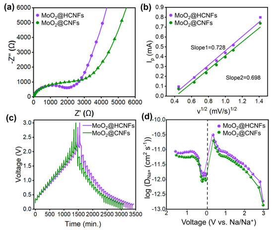 To further investigate the Na+ diffusion kinetics of the MoO2@HCNFs and MoO2@CNFs, electrochemical impedance spectroscopy (EIS) and the galvanostatic intermittent titration technique (GITT) were measured. The Nyquist plots shown in Figure 6a consist of a semicircle in the high-medium frequency region and a sloping line in the low-frequency region, with the semicircle region relating to the SEI film resistance (Re) and charge transfer resistance (Rct) and the sloping line corresponding to the Warburg impendence (Zw) of ion diffusion [39,40,41]. The MoO2@HCNF electrode exhibited a smaller Rct than that of the MoO2@CNFs before cycling. This shows that the MoO2@HCNF electrode is capable of faster charge transfer and ion diffusion, demonstrating its excellent rate performance. Furthermore, the diffusion coefficient can also be calculated using the Randles–Sevcik equation [37,42]: