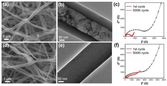 The micromorphology and diffusion kinetics of the MoO2@HCNFs and MoO2@CNF electrodes were further investigated after 500 cycles at 0.2 A g−1 of SIBs. The integrity of the hollow carbon nanofiber structure in MoO2@HCNFs is remarkable, as it exhibited no signs of swelling or collapse after cycling. The overall morphology of the fibers closely resembled their pre-cycling state, with only minimal fiber breaks observed. Similarly, MoO2@CNFs experienced some fiber breaks and agglomerations between fibers (Figure 7a–e). The structure of the electrode material after 500 cycles of charging and discharging was not destroyed, indicating that the prepared hollow structure can provide a buffer space for the volume change in the electrochemical reaction process, and avoids the problem of structural collapse of the material during multiple charging and discharging cycles. This demonstrates the robustness of the hollow structure obtained from the preparation in this work, which is important for the long cycling performance of the electrode materials. In addition, the charge transfer resistance of both the MoO2@HCNFs and MoO2@CNFs decreased after 500 cycles, which is favorable for improving electrochemical performance (Figure 7c,f).