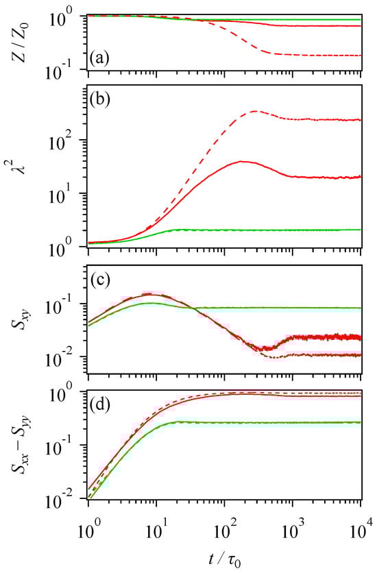- Furuichi, K.; Nonomura, C.; Masubuchi, Y.; Watanabe, H.; Ianniruberto, G.; Greco, F.; Marrucci, G. Entangled Polymer Orientation and Stretch under Large Step Shear Deformations in Primitive Chain Network Simulations. Rheol. Acta 2008, 47, 591–599. [Google Scholar] [CrossRef]