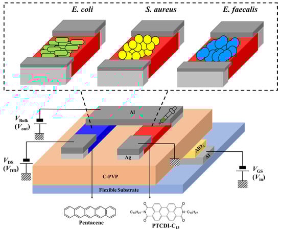 A bacterial sensor was fabricated using ultra-low-voltage-operated organic inverters with PTCDI-C13 as n-type active materials and pentacene as p-type active materials at a bottom-gate top-contact configuration on a 60 µm-thick PI substrate (2 cm × 2 cm). Its gate dielectric was constructed by bi-layer (Al2O3/C-PVP) dielectric systems. After cleaning the PI substrate, an 80 nm thick Al film was thermally deposited on the substrate acting as a gate electrode patterned by a shadow mask. The Al gate electrode was treated with oxygen plasma at 200 W for 10 s to form a thin Al2O3 layer with a high dielectric constant. A blend of poly(4-vinylphenol) (PVP) and poly(melamine-co-formaldehyde) (PMF) with a weight ratio of 12:4 was dissolved in 1-butanol at a concentration of 1 wt.%, which was spun coated on the Al2O3, and baked at 180 °C for 4 h to form a C-PVP thin film. Both Al2O3 and C-PVP acted as the dielectric layer. PTCDI-C13 and pentacene films (60 nm) were deposited on the C-PVP thin film as the n-type and p-type active layers, respectively. After depositing the active layers, the deposition of an 80 nm-thick Al/Ag composite film was used as the source and drain electrode on the active layers through a shadow mask with a channel length (L) and width (W) of 100 and 3000 μm for p-type OFETs and 100 and 1000 μm for n-type OFETs, respectively. The structures of the OFETs and organic inverter used in this study are shown in Figure 1.