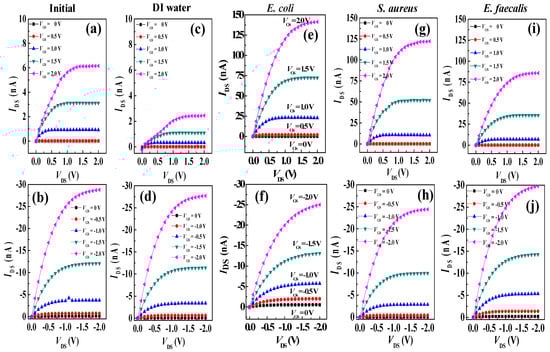 The output characteristics of PTCDI-C13- (upper panel) and pentacene (lower panel)-based OFET biosensors to the addition of bacteria, where (a,b) are non-dropping bacteria, (c,d) are dropping DI water, (e,f) are dropping E. coli, (g,h) are dropping S. aureus, and (i,j) are dropping E. faecalis.