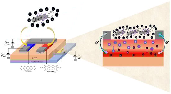 Biosensors, a burgeoning branch of sensor technology, seamlessly blend biological techniques with electronic detection. Their operational framework involves harnessing biological components to identify or detect target molecules, coupled with the generation of detectable signals through physical and chemical elements. In essence, this technology transforms biological reactions into precisely measurable signals, making it a highly sophisticated analytical device. The foundational structure of biosensors comprises biological sensing elements and sensors responsible for identifying target samples and translating biological responses into readable signals []. Among the various approaches, electrochemical biosensors stand out as an advanced method for detecting and estimating bacterial pathogens, representing one of the most researched techniques in biosensor development. These biosensors rely on changes in electrical properties, such as current, potential, impedance, and conductivity, resulting from interactions between biological receptors and analytes [,,]. However, electrochemical biosensors face challenges related to low reproducibility and stability []. In recent years, with the development of science and technology, organic semiconductors have been widely used in various organic electronic devices, such as organic light-emitting diodes (OLEDs) [,], organic solar cells [,], and organic field-effect transistors (OFETs) [,]. OLEDs are widely used in display and lighting applications, while OFETs can be applied in the field of biological detection. OFETs operate based on a three-terminal structure, controlling the flow of charge carriers through organic semiconductor materials by applying an external electric field []. The fundamental principle of OFET biosensors involves modulating the electrical characteristics of the semiconductor based on the attachment of biological analytes to the transistor’s surface. This modulation leads to changes in the transistor’s electrical output, allowing for measurement and correlation with the concentration of biological analytes present in the sample. OFET biosensors have been used to detect various biological analytes, including proteins, DNA, and cells []. Compared with traditional inorganic semiconductor transistors, OFETs have the advantages of low cost, flexibility, and biocompatibility [,,,]. In terms of biological detection, OFET’s materials are mostly organic materials, which have higher sensitivity and detection limits and can detect extremely small biological molecules. By modifying the surface of organic semiconductor with biomolecules or biological systems, highly specific detection of target molecules and rapid response to the presence and concentration of target molecules can be achieved [,,,,]. While most biosensors currently use graphene transistors to differentiate bacteria based on saturation current changes, there has been limited use of organic semiconductors as active layer materials [,,]. In the year 2019, Dye and their research team introduced a bacterium detection method boasting an impressive sensitivity of detecting as low as 103 bacteria per millilitre (CFU/mL). This pioneering approach hinged upon the modulation of the threshold voltage (Vth) in n-type OFETs, enabling the differentiation of various bacterial species []. However, the change in Vth of n-type OFET with bacterial concentration was not significant and had no functional correlation. Furthermore, the threshold voltage must be fitted from the transfer electrical curve, which increases the error in calculating bacterial concentration and consumes energy and time. The influence of bacteria on p-type OFET properties has not been explored in the literature. OFET-based biosensors offer a simple and convenient detection method, eliminating the need for complex sample processing and sophisticated instrument setup. As a result, they possess vast potential for applications in the field of bio-detection.