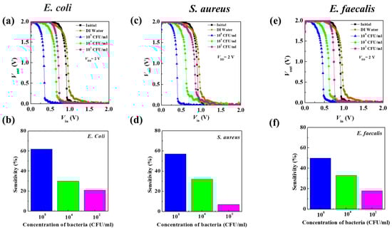 The electrical performance of O-CMOS decreased in different concentrations of bacteria. (a) The voltage transfer curves of the devices dripped with E. coli, (b) the sensitivity at different E. coli’s concentrations, (c) the voltage transfer curves of the devices dripped with S. aureus, (d) the sensitivity at different S. aureus’s concentrations, (e) the voltage transfer curves of devices dripped with E. faecalis, and (f) the sensitivity at different E. faecalis concentrations.