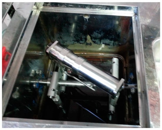 The 290 mL volume laboratory-type supercritical carbon dioxide (scCO2) processing vessel placed inside the oil heating apparatus.