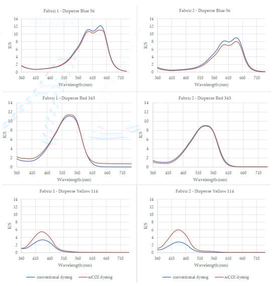 Contrary to the previous observations with low and medium-energy dyes, the high-energy Disperse Yellow 114 dye led to a notable shift in results. Specifically, at the absorption maximum (λmax), the K/S values for scCO2 dyed samples were significantly higher, with a difference of 2.15 for fabric 1 and 3.19 for fabric 2 compared to conventionally aqueous dyed samples.