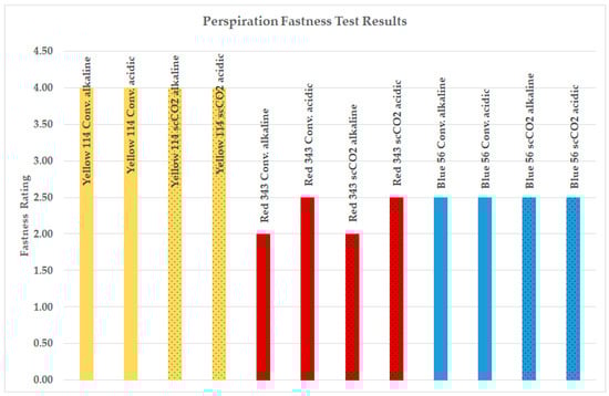 The perspiration fastness test results for the dyed samples of fabric 1 are displayed in Figure 4. As the results for fabric 2 were identical to those of fabric 1, only the results for fabric 1 are presented, for easier comprehension. The perspiration fastness test assesses the color resistance of dyed textiles against acidic and alkaline perspiration. This test simulates conditions where garments come into contact with heavy perspiration, potentially leading to localized discoloration. A colored textile specimen, alongside other fiber materials to test for color transfer, is wetted with simulated acid perspiration solution (pH 5.5) and alkaline perspiration solution (pH 8.0) and subjected to mechanical pressure before drying slowly at an elevated temperature. After conditioning, the fiber materials are assessed for any color transfer.