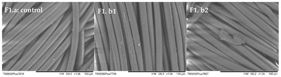 SEM images of the samples of fabric 1 (F1.a) undyed fabric (control), (F1.b1) conventional Disperse Yellow 114, and (F1.b2) scCO2 Disperse Yellow 114.