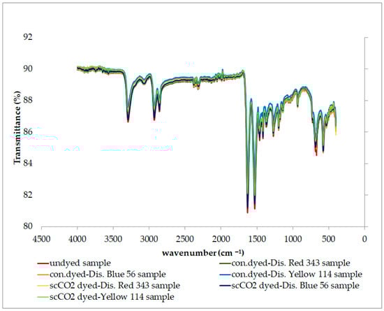 The structural characterization of different PA6.6 samples dyed with varying dyes in conventional aqueous and scCO2 environments was carried out by analyzing functional groups using Fourier transform infrared spectroscopy (FTIR). FTIR plotting of the undyed, conventionally aqueous dyed, and scCO2 dyed samples of fabric 1 are presented in Figure 6; the results were similar for fabric 2. The peaks observed in the graphs in Figure 6 are evidence of the characteristic peaks of PA6.6. The band at 3300 cm−1 is attributed to the hydrogen-bonded N─H stretching [58,59,60,61,62,63,64,65]. The 2933 and 2862 cm−1 peaks are associated with methylene groups’ stretching or stretching vibration (CH2). The appearance of absorption peaks at 1656 cm−1 and 1540 cm−1 belongs to the –N-H stretching band of the amine group. These peaks correspond to the characteristic absorption peaks (stretching vibration of the carbonyl group) and the amid II bonds (bending vibration of the amino group) of PA6.6. [57,58,59,60,61]. The peaks between 1370 and 1200 cm−1, combined with the C─N stretching and N─H deformation vibrations, show the amid III region associated with the N─H in-plane bending. The peaks at 1169 and 959 cm−1 correspond to the skeletal motion of CO─NH and the in-plane vibration of CO─NH, respectively [61,66]. When Figure 6 is examined, it is observed that the type of dyeing process (aqueous or scCO2 environment) did not have a considerable effect that would disrupt the structure of PA 66.