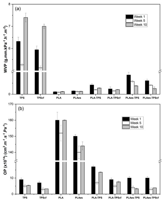 The oxygen (OP) and water vapour (WVP) permeabilities of monolayers and bilayers after 1, 5, and 10 weeks of storage at 25 °C and 53% RH are shown in Figure 1. PLA monolayers exhibit high oxygen permeability but high water vapour barrier capacity, while the opposite behaviour was observed for starch films, according to their respective hydrophobic and hydrophilic nature. The obtained values of WVP and OP of the PLA and starch films were in the range reported by other authors [14,22,31]. The barrier capacity of starch monolayers to both water vapour and oxygen was enhanced by the incorporation of fibres (p < 0.05), whereas the incorporation of RS extract in the PLA monolayer (PLAes) slightly increased the WVP values but reduced the OP values, as observed in a previous study [21]. These effects can be attributed to different factors, such as the changes in the chemical affinity of the polymer (PLA) when polar extracts were incorporated and the potential oxygen scavenging effect of the extract antioxidants, as well as the increase in the tortuosity factor for mass transfer when cellulose fibres are present in the starch films [14].