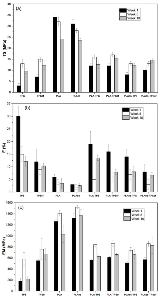 Figure 2 shows the mechanical properties of monolayer and bilayer films after 1, 5, and 10 weeks of storage. At one week of storage, the TS, E, and MS values of starch and PLA monolayers were in the range reported in previous studies [14,36,37]. The presence of active extract negatively affected the mechanical properties of PLA monolayers (p < 0.05). The PLAes film was 10% and 50% less resistant to break and stretchable, respectively, than the control PLA monolayer. This is due to molecular interactions between the extract components (mainly phenolic compounds and carbohydrates) and the PLA matrix, leading to a reduction of PLA interchain forces. The phenolic acids present in the extract can hydrolyse the PLA chains, which also contributes to weakening the polymer matrix. In contrast, the cellulose fibres enhanced the stiffness of the starch films and their resistance to break, as previously reported by other authors [14,38].