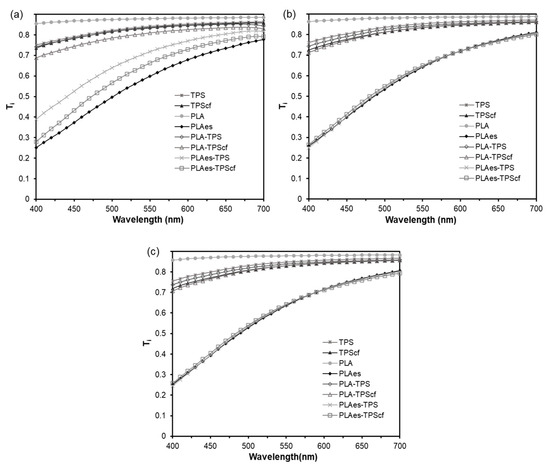 Concerning the appearance of the films, the main change was produced when the RS extract was incorporated into the PLA layer. The RS extract provides the PLA films with a dark brown shade, as well as the light scattering effects produced by the small dispersed particles in the matrix [21]. In fact, PLAes films exhibited the lowest L* and hab* values and the highest colour saturation (Cab*). The PLA monolayer was the most transparent film, exhibiting the highest Ti and L* values, according to the high degree of homogeneity and transparency of the polymer matrix. No significant changes in the Ti or colour coordinates of the reinforced starch monolayer (TPScf) in comparison to the control film (TPS) were observed. Similar results were found by Fourati et al. [37] and Benito-Gonzalez et al. [39] for starch films reinforced with different cellulosic fractions. The bilayers exhibited the coupling of optical properties of the constituent monolayers. The bilayers with extract (PLAes-TPS and PLAes-TPScf) had optical properties closer to the PLAes film since the extract had a great influence on the Ti and colour parameters. Likewise, the presence of fibres in the starch layer (PLAes-TPScf) reduced the sample internal transmittance (Ti) and lightness to a greater extent than when these were not present (PLAes-TPS), leading to a redder and more saturated colour. Nevertheless, the starch layer attenuated the colour effects of the RS extract in the laminates mainly when it did not contain fibres, which promoted a light reflection of the material with the consequent selective absorption of the extract compounds. Indeed, the PLA-TPScf bilayers were less transparent than PLA-TPS, exhibiting a darker and more saturated colour.