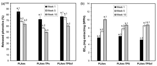 Percentage of phenolic content released from the films with respect to those initially incorporated with the extract (a) and the antioxidant capacity of the extract present in the films (PLAes monolayer and PLAes-TPS and PLAes-TPScf bilayers) (b) stored at 25 °C and 53% relative humidity for 1, 5, and 10 weeks. Different letters indicate significant differences between the formulations at constant time. Different numbers indicate significant differences between the storage times for each formulation.