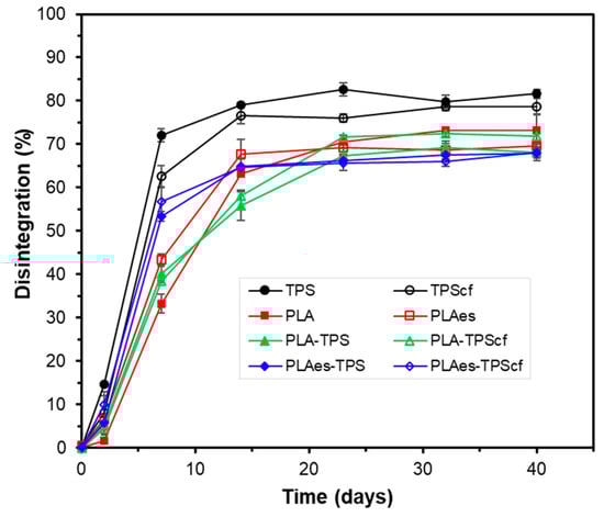 Development of sample disintegration as a function of time for the different monolayer (TPS, TPScf, PLA, PLAes) and bilayer (PLA-TPS, PLA-TPScf, PLAes-TPS, PLAes-TPScf) films. Mean values and standard deviations.