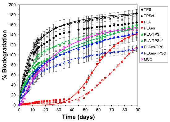 Biodegradation kinetics of CMC, monolayer (TPS, TPScf, PLA, PLAes), and bilayer (PLA-TPS, PLA-TPScf, PLAes-TPS, PLAes-TPScf) films throughout the composting time. Experimental data (symbols) and Hill’s fitted model (lines).