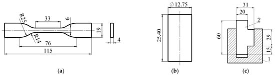 The main properties of the WPCs (density, hardness, strength) were determined in the laboratory of Vytautas Magnus University. Density was determined by weighing five samples with actual dimensions of Ø 12.75 mm × 25.4 mm and then performing analytical volume and density calculations. Tensile and compression tests were carried out using an Instron 5965 (Instron Corporation, Norwood, MA, USA) universal testing machine, while shear strength tests were carried out using the Toni Technik 2020 press machine (Toni Technik Baustoffprüfsysteme GmbH, Berlin, Germany). The testing speed was 20 mm·min−1 (tolerance ± 10%) in all cases. The dimensions of the samples are shown in Figure 1. ASTM D638–14 [] was used for the tensile test and ASTM D695 [] for the compression test. One end of the tensile samples was fixed. Shear strength tests were carried out according to the standard LST EN 13354:2009 []. A special steel bracket, shown in Figure 1c, was used for the shear strength tests. The thickness of the test specimen for the shear test was 15 mm. The ambient temperature during the tests was 21 ± 1 °C and the relative humidity was 40%. Average data from 3 replicates are shown. Strength values were calculated analytically from the stress–strain curves obtained.
