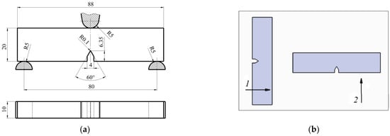 Test specimens for SENB: (a) dimensions of the specimen and notch; (b) notch orientation when milling the specimens from the plate: 1—longitudinally along the extrusion direction (L), 2—transversally (T).