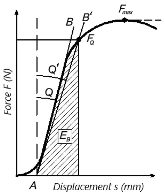 The value of force FQ to be used in the calculation of KQ was determined by analyzing the graph of the relationship between force F and the opening of the crack (in our case deflection s) (see Figure 3). Deflection s is also referred to as the load-line displacement (LLD), this abbreviation is also used below. Line AB, from which the initial contact stiffness Sini, N·m−1 is estimated and which forms an angle Q with the vertical line, is drawn. Then, line ABI is drawn; it is inclined at 5° and has an angle of QI = 1.05Q. If the value of maximum force Fmax is between lines AB and ABI (inside), the value of Fmax is used to calculate KQ. Otherwise, if Fmax is outside lines AB and ABI, the value of FQ is used to calculate KQ. In addition, it is a requirement that Fmax/FQ be <1.1; otherwise, the test is rejected if the 10% non-linearity condition is not met.