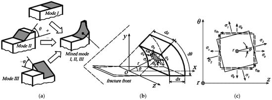 (a) Crack propagation surfaces under pure modes and under mixed mode I/II/III conditions; (b) stress field components acting on an element near the crack front in polar coordinates; (c) stress state in θ-z plane.