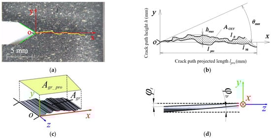 After the tests, photographs of the samples were taken (at 12× magnification) perpendicular to the front and back surfaces (OXY plane), and a graphical analysis of the main fracture trajectories was carried out. To achieve this, the crack path was traced by a polyline, as shown in Figure 5a, using the nanoCAD 5.0 plotting software. As shown in Figure 5b, the following parameters were also evaluated: mean fracture line length lavg, mean projected fracture line length lpro_avg, maximum kink angle θmax from the origin and maximum fracture height hmax from the OXZ plane. The projected area AOXY was evaluated as shown in Figure 5c. The following formula was used to obtain the average kink angle φ of the crack plane, as depicted in Figure 5d: