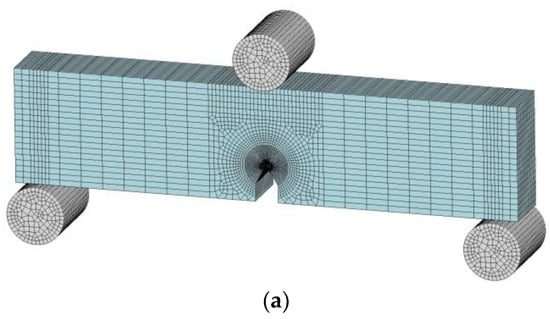 The bodies modeled in the simulation program environment were divided by a finite element mesh. The left and right sides would be identical if the 3D sample model was divided in half through the top of the pre-crack. Given that the radius of the pre-crack tip was R = 0.1 mm, the zone was modeled as an arc in the corresponding finite element mesh. Moving from the tip to its sides, the mesh became coarser in less important areas. The mesh was the smallest at the tip of the crack. The size of the smallest element was about 0.05 mm × 0.07 mm × 0.5 mm, and the volume was 1.57 × 10−3 mm3. The size of the largest elements outside the notch zone was 3.75 mm × 1.0 mm × 0.5 mm.