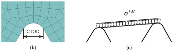Solid FE model: (a) SENB test scheme; (b) enlarged view of the vicinity of the crack tip and CTOD measurement site; (c) a scheme of the evaluation of the average von Mises stress in the crack front elements.