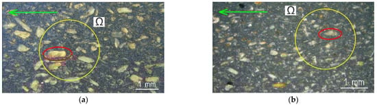 Optical microscope (OM) images of the surfaces of the composites: (a) WPC-A; (b) WPC-B. The green arrow symbol indicates the direction of extrusion (L-direction), the yellow circle indicates the domain of interest Ω and the red ellipse symbol indicates the measured wood particle.