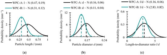 Figure 8 illustrates that in comparison to WPC-B, the average wood particle in the WPC-A composite was approximately 34% longer and 31% larger in diameter. Nonetheless, the flatter distribution curve means that the scatter of WPC-A data was greater. This suggests a higher degree of size uniformity in WPC-B particles within the domain Ω of research. While high scatter in WPC-A makes it challenging to report on meaningful differences in the means, the l/d ratios of the two composites were comparable, with the WPC-A composite having a slightly higher (8%) ratio.