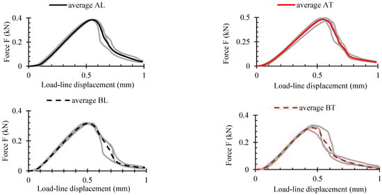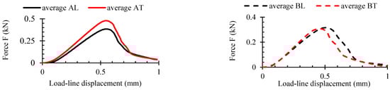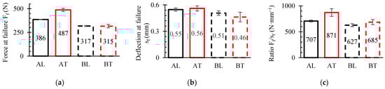 Figure 10 displays the mean curves (black and red) and the curves of the three tested samples (grey) from the SENB experiment. Figure 11 displays the maximum values attained during the experiment. The mean force-deflection curves were plotted and assessed using OriginPro 2024 (Learning edition, USA). It is evident that up until the maximum load Fmax was reached, there was little scatter in the data. However, scatter increased once plastic degradation started, as was also revealed in tensile, compressive and shear tests. The WPC-B composite showed a higher degree of data dispersion, as the SENB curves demonstrated. The dispersion of fracture results was directly impacted by this. In Figure 11, the force magnitude in N per unit of displacement mm is displayed through the calculation of the average relative ratio of maximum force Fmax and displacement to plastic failure limit sf as shown in Figure 11c. As can be observed, more force was needed for crack propagation in the AT and BT directions than in the L direction for both composites. While the differences between BT and BL were smaller, at about 8.5%, the AT direction required an average force per unit displacement that was approximately 19% higher (more work and energy demand) than the AL direction. If the various composites are compared in the same direction of testing, the AT ratio in the T-direction was 21% higher than of BT, and the difference in the L-direction was nearly twice as large. However, the AL composite still had a 10% higher AT ratio than BL.
